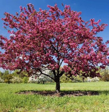 The Prairifire Crabapple is kown for its bright red flowers in spring, followed by small, reddish apples. Gorgeous dark red autumn foliage.